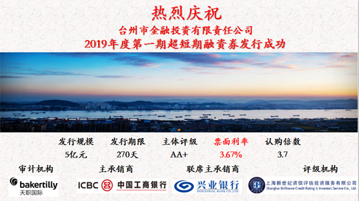 5月13日,市金投集團成功發(fā)行2019年度第一期超短期融資券5億元,主體評級AA+,期限270日,全場認購倍數(shù)3.7倍,債券票面利率3.67%,利率在同期發(fā)行的城投類公司中處于較低水平。超短融的成功發(fā)行,不僅在改善公司整體債務結構、降低融資成本等方面意義重大,也為公司壓實有息負債、防范融資風險、健康發(fā)展保駕護航。