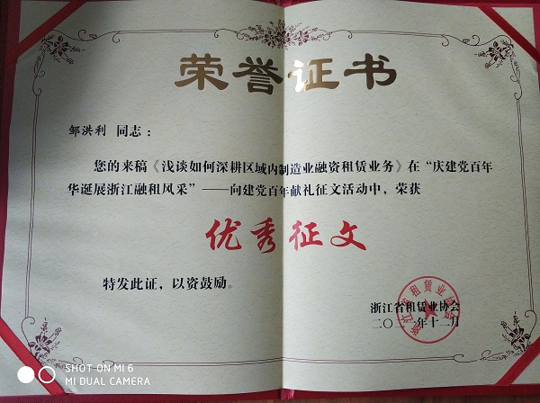 同時(shí),浙江臺(tái)金融資租賃有限公司選送參加“慶建黨百年華誕展浙江融租風(fēng)采”向建黨百年獻(xiàn)禮征文活動(dòng)的文章——《淺談如何深耕區(qū)域內(nèi)制造業(yè)融資租賃業(yè)務(wù)》,在各類選送作品中脫穎而出,入選“優(yōu)秀征文”名單。