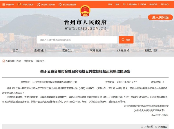 11月10日,臺州市政府與市金投集團簽訂《公共數(shù)據(jù)授權(quán)運營協(xié)議》,標(biāo)志著市金投集團成為臺州首家公共數(shù)據(jù)授權(quán)運營單位,依法開展科創(chuàng)、綠色和小微普惠場景公共數(shù)據(jù)授權(quán)運營活動。