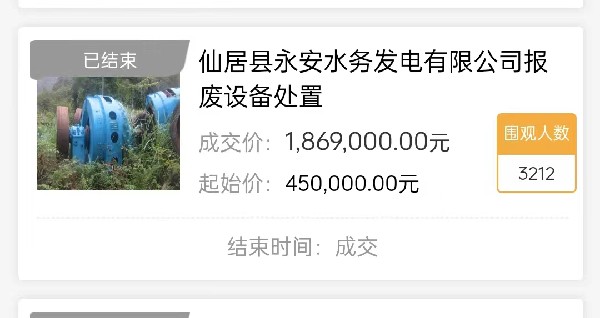 自統(tǒng)一全市國有資產(chǎn)公開交易平臺以來,11月20日,仙居首宗項目——仙居縣永安水務發(fā)電有限公司報廢設備處置成功高溢價成交。該項目起拍價45萬元,經(jīng)573輪次競價,最終成交價186.9萬元,溢價率高達315.33%,創(chuàng)下2023年以來新高。