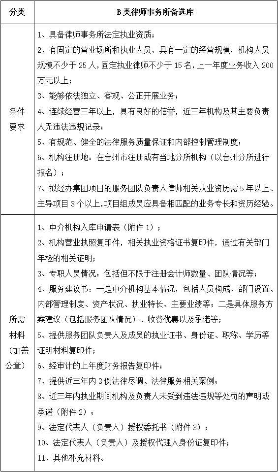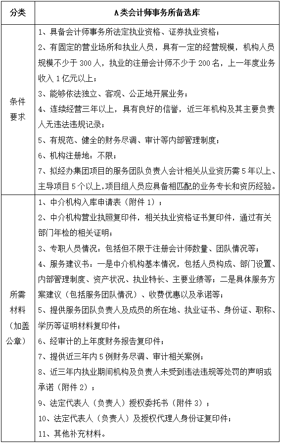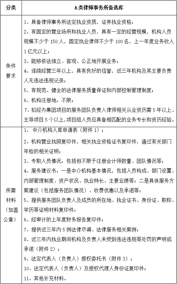 為更好的滿足集團(tuán)財(cái)務(wù)審計(jì)、財(cái)務(wù)盡調(diào)、法律服務(wù)、法律咨詢等專業(yè)服務(wù)需求,集團(tuán)擬對會(huì)計(jì)師事務(wù)所、律師事務(wù)所備選庫開展中介機(jī)構(gòu)入庫申報(bào)選聘工作,現(xiàn)將有關(guān)事項(xiàng)公告如下: