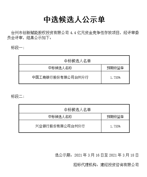 臺州市創(chuàng)新賦能股權(quán)投資有限公司4.4億元資金競爭性存放項目中選候選人公示單