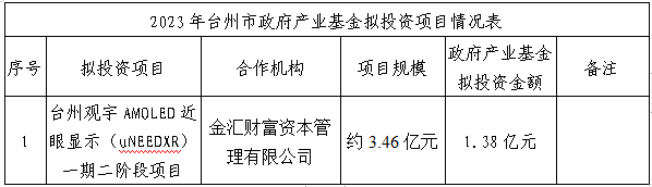 根據(jù)《臺州市政府產(chǎn)業(yè)基金管理辦法》(臺財(cái)企發(fā)〔2021〕6號)等有關(guān)規(guī)定,為發(fā)揮政府產(chǎn)業(yè)基金引領(lǐng)作用,臺州市政府產(chǎn)業(yè)基金擬投資的1個(gè)項(xiàng)目(定向基金),已由臺州市金融投資集團(tuán)有限公司決策委員會(基金管理委員會)審議通過,現(xiàn)將擬投資項(xiàng)目予以公示。如有意見,可向市金投集團(tuán)反映。