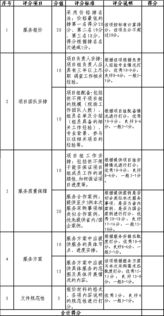 采用綜合比選方式,總得分為100分。根據(jù)評審結(jié)果,從高到低選擇1家服務(wù)供應(yīng)商作為本次采購服務(wù)的合作機(jī)構(gòu)。