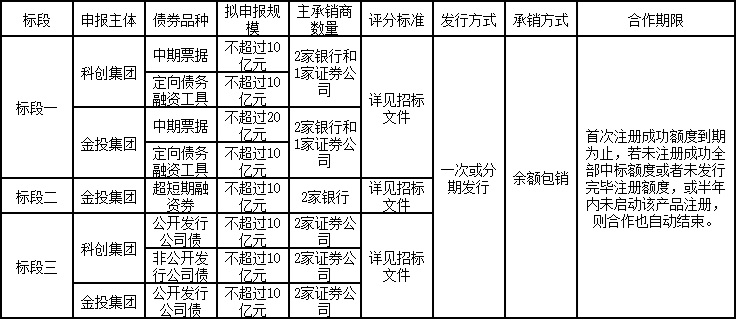 發(fā)行債券主體為科創(chuàng)集團和金投集團。共分為三個標段,通過公開招投標形式評選承銷商,總共采購6家銀行,6-8家證券公司,標段一共計采購4家銀行和2家證券公司,標段二共計采購2家銀行,標段三共計采購6家證券公司,具體見下表: