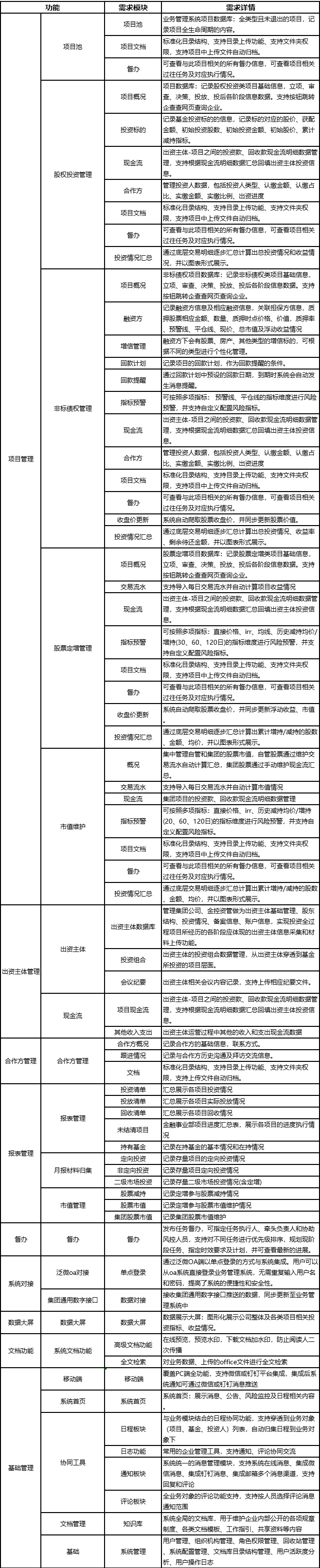 1.應(yīng)答方需根據(jù)我司現(xiàn)有的業(yè)務(wù)類型和管理模式等要求,開發(fā)一款適合我司的資管業(yè)務(wù)管理系統(tǒng)。系統(tǒng)具體需要實(shí)現(xiàn)的功能詳見下表: