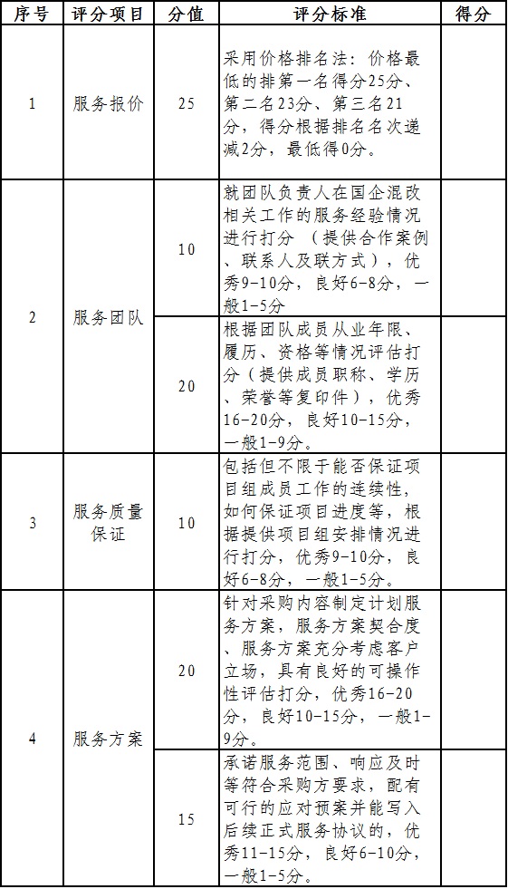 信息發(fā)布后由集團(tuán)確定評(píng)審小組,組織采購評(píng)審,確定成交供應(yīng)商。擬采用詢比采購方式進(jìn)行評(píng)審,具體見下列評(píng)分表,根據(jù)評(píng)審結(jié)果,擇優(yōu)選擇專業(yè)中介機(jī)構(gòu)。