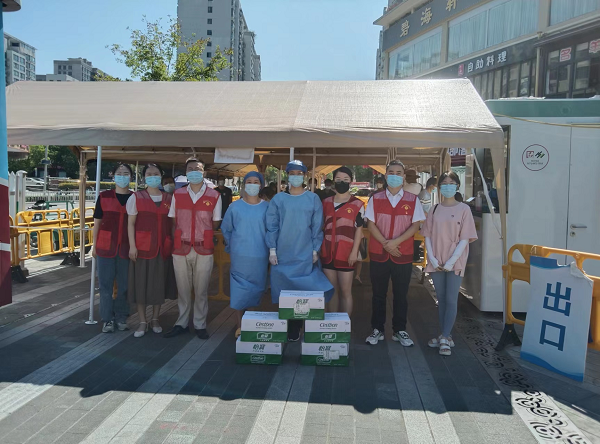 家住廣廈社區(qū)的何女士,因丈夫患有腎衰竭,2019年做了腎移植手術(shù),需要長(zhǎng)期服藥和照顧,家里收入甚微,支部黨員們?yōu)檫@個(gè)困難家庭購買了生活物資。隨后,大家來到核酸檢測(cè)點(diǎn),天氣持續(xù)高溫給核酸采樣的工作人員們帶來了不小的挑戰(zhàn),支部黨員們?yōu)椤耙痪€戰(zhàn)疫”人員送上礦泉水,向“一線戰(zhàn)疫”人員致敬。